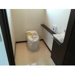 少しでもトイレの中を広くとるためにタンクレストイレをご採用。 掃除のしやすさにこだわりのお客様に大建のハピアフロア トイレタフをご提案。汚れに強くシミになりにくいトイレ専用の床材です