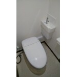 収納棚とドアの挟まれた形の便器。タンクレストイレで手洗い器を設置するにはコーナータイプの手洗い器をお勧めしました。給排水も便器からとることができるので工事も1日で終わります。