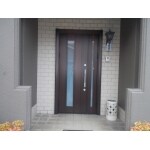 既設の玄関は袖付き片開きドアになっており、カバー工法用の商品で袖部分も開閉できるように親子ドアにしました。