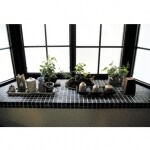出窓カウンターに、キッチンと同じ黒色モザイクタイルを貼り、一体感を高めました。ディスプレイした盆栽と苔玉を眺めるのは、癒やしの時間。リフォームをきっかけに、奥様が新しく始められたという盆栽は、「なかなか難しい」と、楽しそうに話されていました。