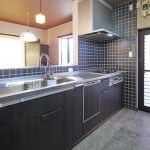 奥様のお好みに添えるよう、パナソニックのリフォムスをステンレスカウンターでご提案しました。業務用キッチンのような無骨さもありながら、機能性、収納量、使い勝手の良さをショウルームでご体感いただき、採用することに。 キッチン廻りは、あえてキッチンパネルを使わず、黒色モザイクタイル貼りにしました。釉薬で表現した布目模様の濃淡や陰影が味わい深く、キッチンを特別な場所にしています。 フロア材は、アーキスペックフロアーの芦野石柄で、古民家の上質な土間空間をイメージしました。