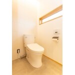 窓は縁の小さいFIX窓でスタイリッシュに。 便器の背面にエコカラットを貼り、間接照明を設置しました。