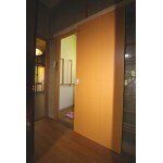 現場のトイレは部屋と浴室に挟まれた形で設置してあるので、一般的には引き戸は設置できず、現状通り開き戸しか設置はできませんが、ドア1枚分を廊下側に出してしまって、外側に引き戸を設置すれば、条件が良ければ設置が可能になります。 お客さまの場合には引き戸を開いたときに浴室側に扉が移動しても、干渉する物が無かったので、「アウトセット引き戸」をオーダーで作って設置いたしました。 最初はできないと思われていたようですので、「可能ですよ」とお伝えしましたところ、たいへん喜んでいただきました。