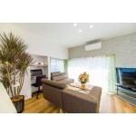 キッチンとリビングがひと続きになっているので、エアコンが効きやすくなった。 キッチンから見えるリビング正面壁にグラビオエッジえお貼ってアクセントにした。
