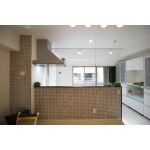 リビング側から見えるキッチン前面と壁の一部に細かめのタイルを採用し、とてもオシャレな雰囲気のリビングに仕上げました。 ホワイトを基調に、タイル、リビングドア、照明をブラウン系でまとめ、明るいお部屋ながらもホッとする印象のリビングルームです。