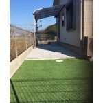 水勾配をとり水はけを良くし、雑草防止のため防草シートを敷きました。 勝手口側は防犯のために白バラスを、お部屋側は犬が遊べるように人工芝にしました。