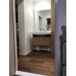 トイレは廊下の途中にありドアでの出入りもしづらいので、トイレの壁を撤去して廊下兼トイレとして広く使えるように、洗面は座ってお化粧できるように、浴室は規格サイズでなかったので、ピッタリサイズのユニットバスにするように提案しました。