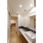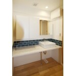 並んで使える広々カウンターがある洗面化粧台へと交換。必要に応じて、カウンター下に収納家具が入れられるようになっています。