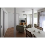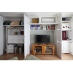 DKに隣接した和室を解体し、リビングに改修するにあたって、LDKまわりでお使いの物を効率的に収められる壁面収納を造作しました。隣家が迫り、十分な採光がとれなかった窓の上部を活用して吊戸を新設。エアコンの目隠しも兼ねています。また、寸法に応じて、収納扉には既製品と造作とを採用。それらの調和を図ることで清々しい空間を実現しています。