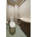 トイレ手洗いカウンターはダイノックシートを張り、カタログからいくつかサンプルを取り寄せ、現場で一つ一つ合わせながら色柄をセレクトしました。