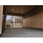 正面の木製の格子戸は全開口出来るようにしてあります。 天井の杉板、腰壁の桧板、土間の洗い出しコンクリートが上手く調和しております。 センサー式のダウンライトは、夜の雰囲気をよりよくしています。 使いやすい、門兼用の車庫に仕上がりました。