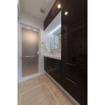 扉は高級感のある鏡面木目シリーズのカームウッドダークを選び、住まい全体のイメージを統一しています。