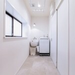 清潔感のあるホワイトが美しいランドリールーム。スロップシンクを備え、つけ置き洗いして、洗濯機を回すのもスムーズです。 キッチンダイニングと同じフロアタイルを貼り、統一感を持たせます。耐久性があり水に強いので、洗濯物を干すのも安心。