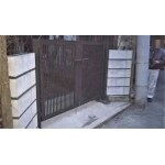 既存木製門扉撤去、ブロック鉄筋工・ブロック5段積み、門扉支柱設置、扉本体取付
