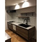 キッチンの背面には部屋全体を印象付ける白いタイル、木目調の飾り棚と収納庫でご要望のカフェ風デザインをご提案しました。また、調理台の上は空間を活かすダウンライトにしモノトーンデザインが映えるデザイン重視のキッチンをご提案しました。