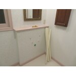 ピンクを基調とした洗面所でクロスにラインを入れ上下柄の違うクロスが貼られていました。
