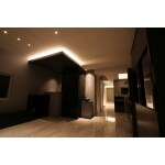 床はタイルを使用し、空間のアクセントに御影石を使用。常に本物感を感じるような高級感ある空間へ。 モノトーンカラーをベースに理想の形を作っていきました。 昼は明るい日が空間に差し込み、きれいなタイルに反射してよりエレガントな印象に。 夜は間接照明で一気にムーディな印象に。昼夜それぞれに空間に表情があります。