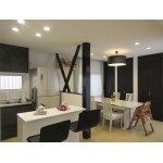 キッチンの位置を変更しました。また、隣の部屋との間仕切りを取り一体感のある広いLDKに仕上げました。取り外すことのできない柱と筋交いは残しデザインの一部としました。