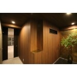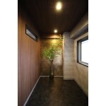 部屋数を少なくしても良いとのことで、玄関土間を広く取り、季節ごとに花を活けられるスペースとして作りました。壁に金色のフロアタイルを貼り、木目調の壁紙と石目調の床材を貼り合わせることで、玄関に入った瞬間のイメージにこだわって作りました。