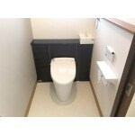 キャビネット内にトイレが収まりすっきりとした印象に。 提案したアクセントクロスもお気に召していただけました。