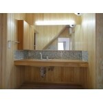 1枚板のカウンターにTOTOのアンダーシンクを取付けました。シャワー水栓廻りには石をはめ込んで、水濡れにも対処しています。