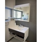 幅900のカウンターとなり、フロートオープンタイプで足元すっきりになりました。室内のお掃除がしやすくなりました。電気代のかからない「くもりシャット」で鏡が曇らず快適です。三面鏡は収納力もあり、中で充電しながら収納出来るスグレモノです。LED照明なので明るくエコな洗面室となりました。