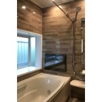 浴室は古いお風呂を解体しユニットバスを入れ替えます。ご要望のテレビがあるリラックスできる空間とするためのユニットバスを提案、テレビをオプションで付け、パネルは全面落ち着いた色調の鏡面パネルに。出窓の気になる汚れはサッシのパッキンを交換し、出窓の天井部分はダイノックシートを貼り清潔感を出し対処。 洗面室は化粧台を入れ替えたほか、壁・クロスと床のクッションフロアを貼り替え、化粧台との色調が取れたラグジュアリーな空間を提案。