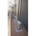 簡易的な防草解決策として、砂を慣らし水を撒くと固まる土でご提案しました。 固まる土を施工すると溜まった水の浸水速度が落ちる為、水はけを考慮し、室外機回りはレンガで囲い砂利敷とする事で水溜まりにも配慮した施工となっております。