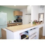 木目調のナチュラルな対面キッチンです。 キッチンの後ろにも収納がついているので食器もたくさん収納できます。 また、対面キッチンにする事によって、キッチンの反対の壁に収納を造作し、電話や小物などを収納できます。奥には見られたくないものを仕舞える扉付き収納もあり、使い分けをすることができます。