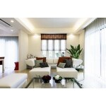 横に長かったリビングルームは、3人掛けソファを置いてもゆとりがあったため、さらに1人用ソファを2つ置き、リビングの中のサロン的コーナーとして演出していた。