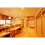 平屋建てで増築をしたところに小屋裏収納を設置。 さらに造付のパントリーも設けました。 内装は無垢仕様に一新。 水回りやリビングは共有ですが、寝室エリアは東西に分け、プライバシーを確保するように配慮しました。