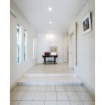 玄関ドア方向を見た玄関ホール。外部に面した壁をふかして、壁埋め込みの玄関収納を設けていたため、採光が少なかった。