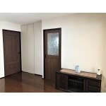 一部、間取り変更して、すっかり風景が変わりました。 写真左にあった収納開口部を壁でふさぎ、収納スペースは対面する部屋で利用。廊下へ抜けるドアもダークブラウンで落ち着きがあり、天井まである収納を増設し、お部屋がスッキリしました。