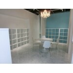 店舗内の家具やシェルフはH様との打ち合わせて決めさせていただきましたこだわりの商品です。 エントランスのソファーとシャンデリアはアンティーク調で揃えました。 キッチンカウンターの椅子、カフェスペースの丸テーブルと椅子、ワークスペースの透明の椅子、 エントランスのフロアーランプや下駄箱、シェルフはIKEAの商品です