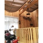 | その他採用機器・設備 | 床:合板捨貼の上2×6材直貼り、内部壁:節有杉羽目板貼り、屋根:3mmポリカ平板屋根、外部屋根:杉羽目板貼り、木製建具:節有杉羽目板貼り、四方板金廻し(杉板色合せ)、格子窓付(トーメイガラス)、 |