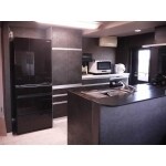 元々リビングはご主人様セレクトの黒い家具でインテリアが統一されています。クローズされていたキッチン空間をオープンキッチンにした際に、ダークなキッチンを選ぶ事でリビングのインテリアと統一感を持たせました。キッチン空間のみ張り替えた床は大理石調にし、黒と白のコントラストがアクセントとなっています。