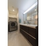 キャビネット横に有った埋込収納をなくし、1200サイズの洗面化粧台をすっきり設置。シックなダークウォルナットの扉と大理石調のクッションフロアで高級感のある、ホテルライクな洗面空間になりました。