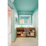 プラン:室内に光をもたらす道路面の窓は上下に分け、人の目線の位置は壁になるよう工夫をしました。 各室を引き戸にして夏は開放をし風を通し、冬は扉を閉め2階、外部からの冷気が入りにくいようにしました。 洗面~WIC~LDKは回遊動線を設け6人の家族でも使いやすいようにしました。 玄関土間は広めに設け、マウンテンバイクや6人分の靴、コートなどが収納できるようにしました。 デザイン:撤去できない鉄骨の大梁を利用して間接照明を設け、空間に変化をつけました。 TV台や室内物干しなどに使用したアイアンのブラックがアクセントになり、空間を引き締めています。 ・性能:外部に接する部分には新たに断熱材を施工し、既設窓には内窓を設け性能を向上させました。