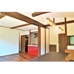 風通しの良いキッチン窓からの”笹の葉”は癒しの景色を堪能しながら、作業できます。勝手口を塞ぎ冷蔵庫を置き、対面・ペニンシュラキッチンで家事動線がスムーズとなりました。また、鮮やかなファインレッドが古民家風のお家の雰囲気と合いますね。