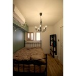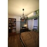 まるで童話の世界にいるような雰囲気の寝室に仕上げました。 ベッドの枕元側の壁には、リビングルームとつながっている室内窓を設置。寝室にいるときでも、家族の気配を感じながら過ごすことができます。 アクセントクロスに落ち着いた色合いのグリーンと、ダークブラウンの造作棚、オスモオイル塗装の無垢フローリングを採用することで、ナチュラルな空間となりました。
