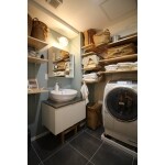 ホワイトを基調に、アクセントクロスや棚板もナチュラルな雰囲気のものを採用することで、北欧風のとってもかわいらしい洗面室に仕上げました。施主様の収納のチョイスも相まって、大変オシャレな雰囲気になりました。