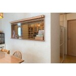 部屋の木目と調子を合わせるためリビングのブラインドと色柄を合せ、キッチンとの間仕切り閉鎖感が無いようにするために透明の引き違い間仕切りを提案。