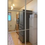 開口はブラインドで、入り口は透明な引き戸で火を使うキッチンに猫ちゃんが入れない様にして、猫の安全と邪魔をされないお料理の時間を確保しました。