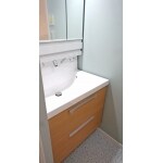 ユニットバス1坪タイプを入れるために、洗面室は以前より小さい1.5畳程度となり、洗面化粧台は750ミリサイズです。画像の反対側にはガス洗濯乾燥機を取付けました。洗面化粧台のアッパーキャビネットにもキッチン同様ダウンウォールを搭載し、スペースの活用をしました。