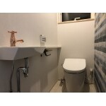 この度の新型コロナウィルスの影響もあり仕入れが難しかったので国産のジャニスのトイレをご提案しお引き渡し優先のご提案し、ショールームにて実際にお座りになってもらい気に入っていただけた様子。 手洗い器の蛇口をご指定の色にするためにメーカーの手洗い器の既製品ではなく給排水管、手洗い陶器、蛇口を厳選しました。 一番難しかったのは貼り分けのクロスの選定のご提案。 担当の私の趣味を伝えさせていただきました。 白の壁紙にピンクゴールドが映える手洗い器の反対の壁に青色が際立つデニム色を選定。 1発合格をいただきした。