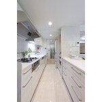 ・壁を取り払いダイニングと一体に ・ダウンライトや壁面にエコカラットを設置しインテリア性を高めた ・白を基調としエレガントな内装に