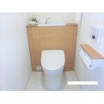 木目調のライトウッド色をアクセントに、ナチュラルで明るいトイレへと。エコカラットを取付け、より清掃しやすく。