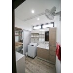 (旧株式会社ウイングでの事例です。)調湿性のあるスイス漆喰を採用して、自然素材を使った提案をしました。収納力のある洗面化粧台を入れました。埋込の天井ホスクリーンを採用したので、雨の日でも調湿性のあるスイス漆喰のおかげで問題なしです。