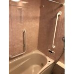 浴室は、マンションの浴室リフォームを行いました。(給湯器交換工事も併せて) 手すりを付けることで浴槽からの出入り時・立ち上がりの際、安心です。 また、ドア枠を少し大きく囲うことで脱衣所の内装費用を抑え、なおかつ綺麗に納めることができます。