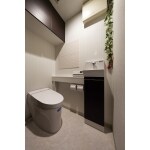 ・ウォールキャビネットや手洗いキャビネットをダークブラウンで統一しモダンな印象にコーディネートしました。 ・コンパクトサイズのトイレを採用し空間を広げました。 ・ウォールキャビネットや手洗いキャビネットを新設し、収納力を確保しました。